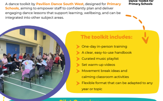 LEAP is a comprehensive dance toolkit for Primary Schools created by Pavilion Dance South West. It includes 5.5 hours of in-person training with accompanying videos and handbook offering PE leads and teaching staff an easy-to-use framework involving a mix of set exercises and creative tasks.